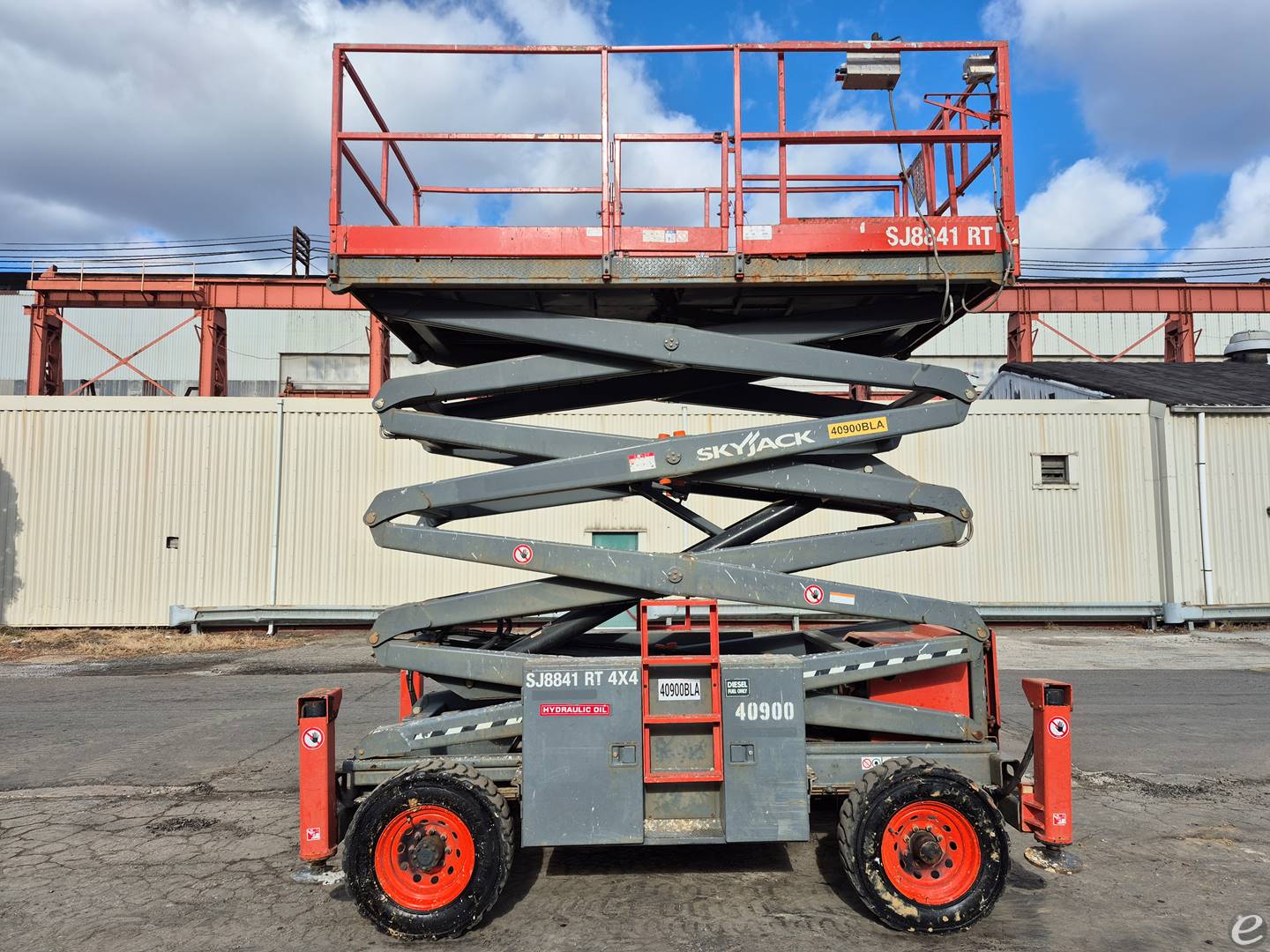 **General Specifications** - Model Number: SJ8841RT - Manufacturer: Skyjack - Type: Scissor Lift - Subtype: Scissor Lift **Dimensions** - Overall Width: 7 ft 3 in - Overall Length: 12 ft 11 in - Overall Height (Stowed): 8 ft 6 in - Platform Width: 5 ft 10 in - Platform Length: 10 ft 4 in - Wheelbase: 9 ft 2 in - Ground Clearance: 1 ft 1 in **Platform** - Platform Capacity: 1,500 lbs - Platform Height (Stowed): 5 ft 1 in - Platform Extension Capacity: 300 lbs - Platform Extension Length: 5 ft **Performance** - Drive Speed (Stowed): 3.5 mph - Drive Speed (Raised): 0.6 mph - Gradeability: 30% - Turning Radius (Inside): 6 ft 6 in - Turning Radius (Outside): 15 ft 3 in - Raise/Lower Speed: 60/50 sec **Power** - Power Source: Diesel Engine - Engine Model: Kubota D1305 - Diesel - Horsepower: 24.8 hp **Tires** - Tire Type: Foam-Filled - Tire Size: 10 x 16.5 in **Weight** - Machine Weight: 13,600 lbs