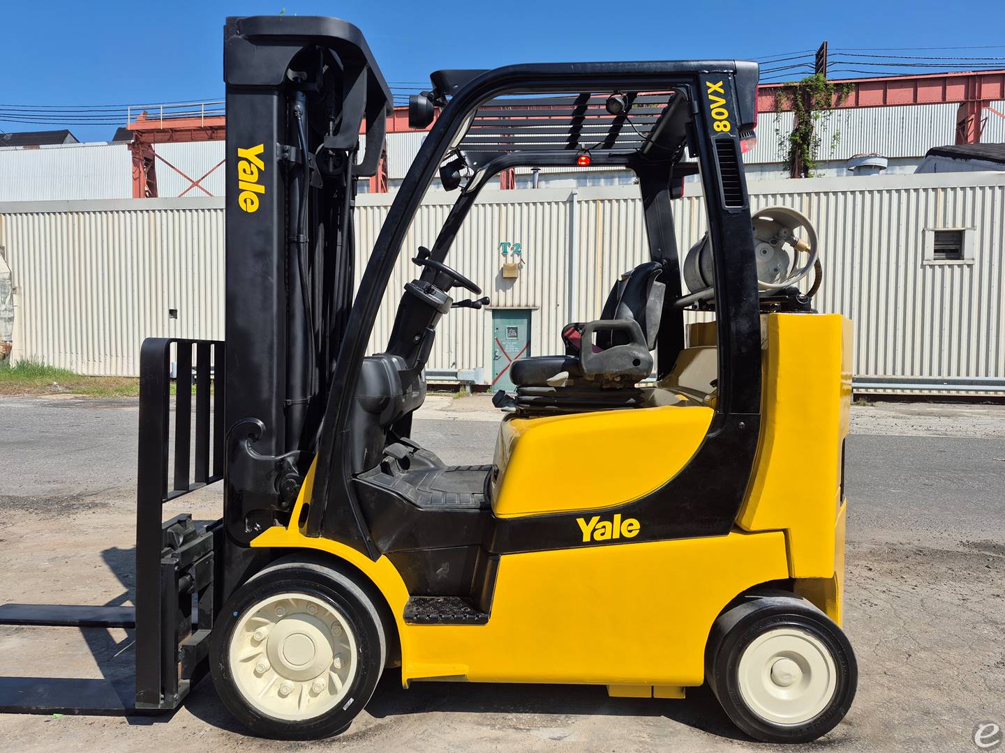 MAKE: YALE, MODEL: GLC080VX, SN: G818V03074S, FUEL TYPE: PROPANE (BOTTLE NOT INCLUDED), SOILD TIRES, 8,000LB LIFT CAPACITY, 48" FORKS, 94" LOWERED HEIGHT, 201" RAISED HEIGHT, 3 STAGE MAST, SIDE SHIFT, SHIPPING DIMENSIONS: LENGTH 152" WIDTH 54" HEIGHT 96" WEIGHT 14,410LBS