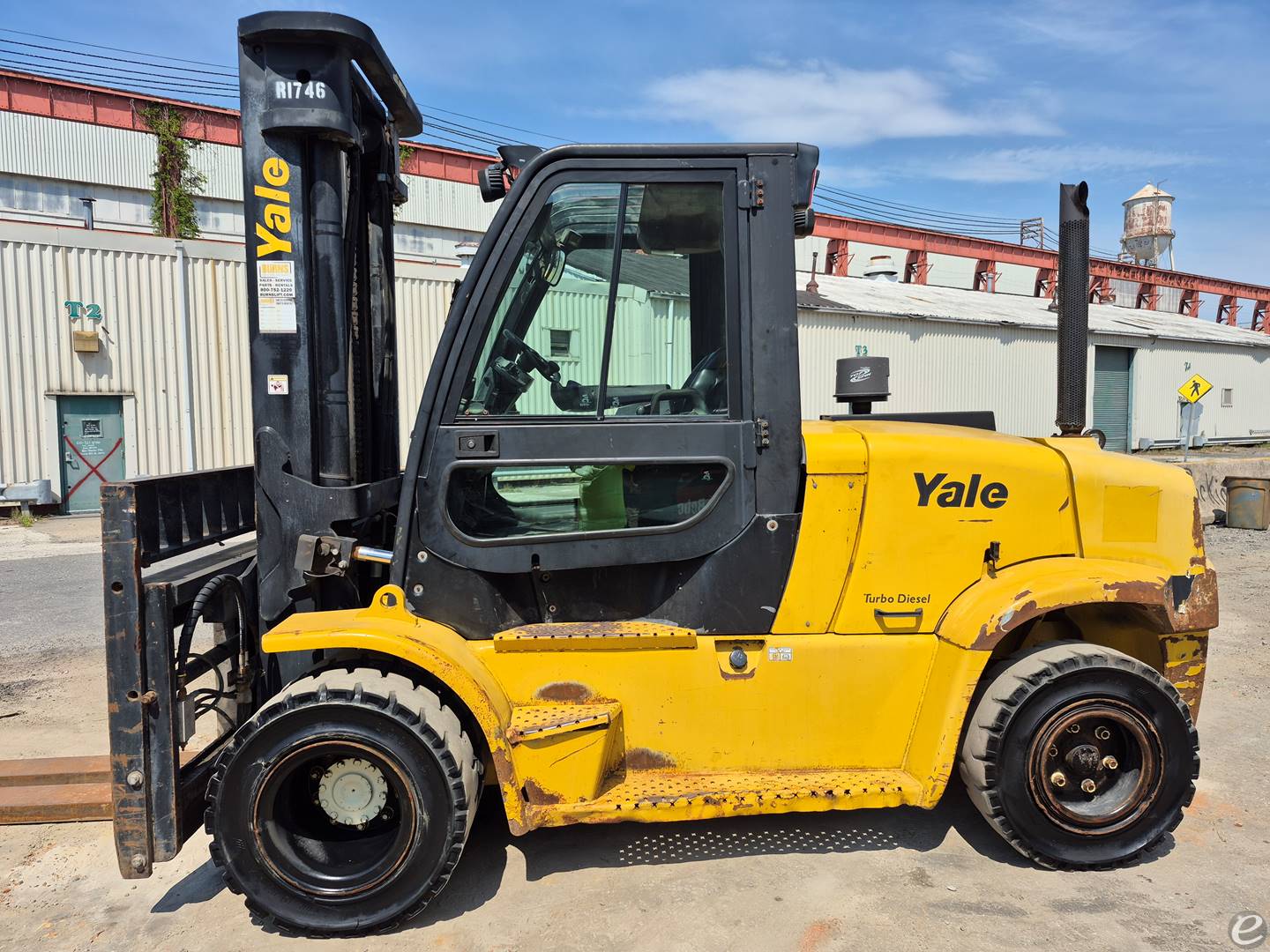 MAKE: YALE, MODEL: GDP190VX, YEAR: 2014, SN: B909V01527M, KUBOTA DIESEL ENINGE, ENCLOSED CAB EQUIPPED WITH HEAT, SOLID PNEUMATIC TIRES, 19,000LB LIFT CAPACITY, 83" FORKS, 116" LOWERED HEIGHT, 140" RAISED HEIGHT, 2 STAGE MAST, FORK POSITIONERS, SIDE SHIFT, SHIPPING DIMENSIONS: LENGTH 244" WIDTH 92" HEIGHT 116" WEIGHT 12,580LBS