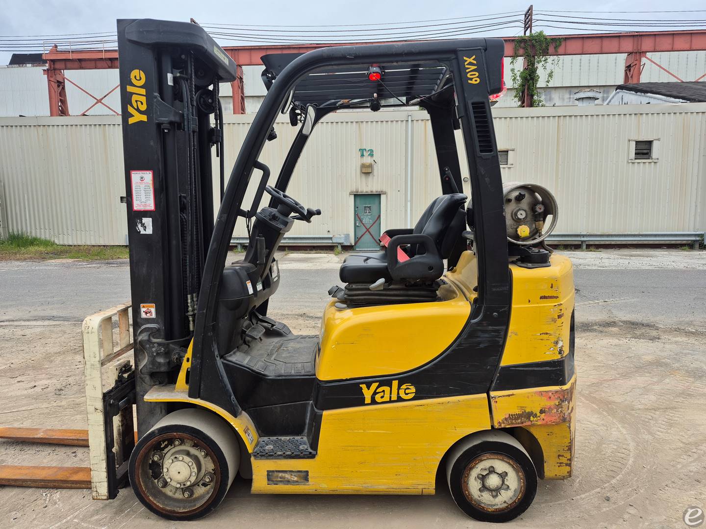 MAKE: YALE, MODEL: GLC060VX, SN: C910V13989U, FUEL TYPE: PROPANE (BOTTLE NOT INCLUDED) 6,000LB LIFT CAPACITY, SOLID TIRES, 42" FORKS, 90" LOWERED HEIGHT, 200" RAISED HEIGHT, 3 STAGE MAST, SIDE SHIFT, SHIPPING DIMENSIONS: LENGTH 132" WIDTH 44" HEIGHT 90" WEIGHT 10,340LBS