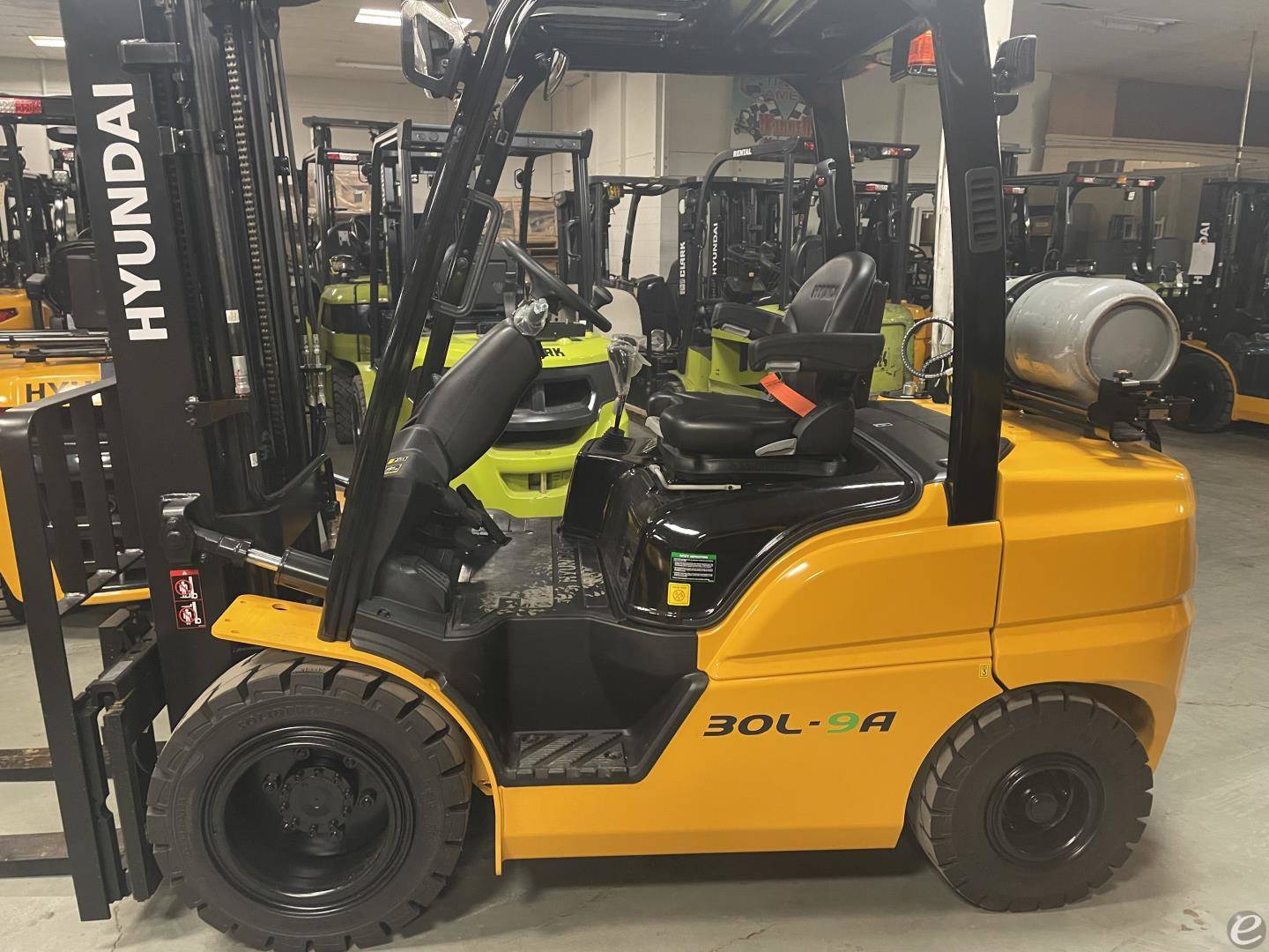 Currently Out On Short Term Rental This 2024 Hyundai 30L-9A is a new LPG/Propane forklift with a 6,000 lb capacity. Equipped with sideshift and free lift. Mast lowers to 90" and raises to 197". Tires: Solid / Solid Pneumatic. Hydraulic: 3 Spool valve(s). Fork size: 2X5X48 III. Operating weight: approximately 10,075 lbs. Serial number: HHKHHF32CF0001483. New unit available for immediate sale.