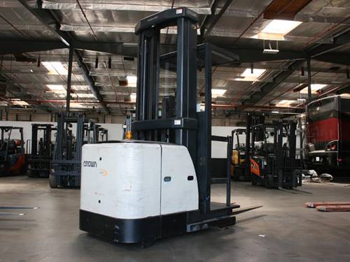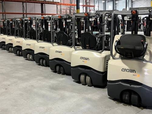 The Crown Cushion Tire Forklift is equipped with advanced safety features such as a low-profile design that improves visibility, allowing operators to see their surroundings clearly. It also includes stability systems and automatic speed controls to enhance safety during operation. Regular maintenance and proper training further contribute to a safe working environment.