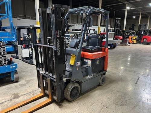 The Toyota 7FBCU15 electric stand-up forklift has a load capacity of 3,000 lbs. This makes it an excellent choice for operations that require handling moderate to heavy loads in tight spaces, typical in warehouse or distribution center environments.