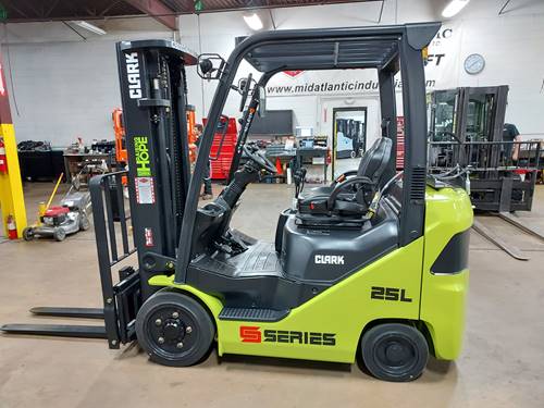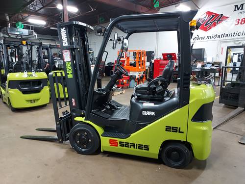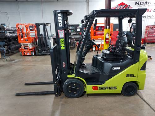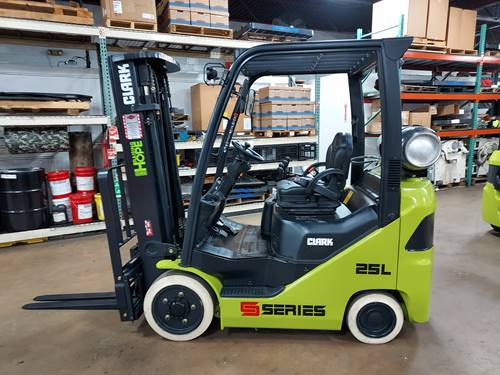 Cushion tire forklifts, such as the Clark S25C, are designed for indoor use and are ideal for smooth surfaces commonly found in warehouses. They provide excellent maneuverability in tight spaces and offer a lower profile, which can be beneficial in environments with low overhead clearance.