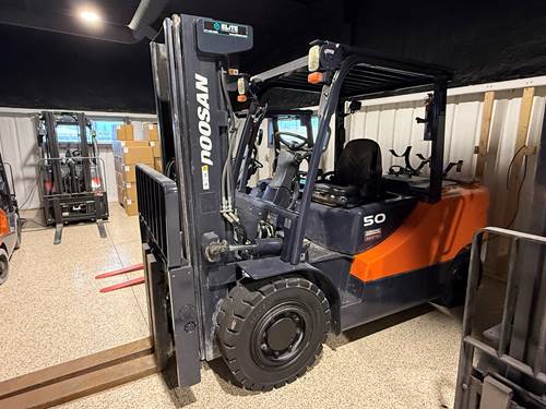 The Doosan G50C-5 is a high-performance forklift known for its robust design and reliable operation in various industrial settings. It typically features a powerful engine, exceptional lifting capacity, and advanced hydraulic systems, making it suitable for heavy-duty applications. The model often includes ergonomic enhancements for operator comfort and safety, such as an adjustable steering column, spacious operator compartment, and enhanced visibility. Additionally, the G50C-5 is designed for efficient fuel consumption and low emissions, aligning with environmental standards. Its durability and ease of maintenance are also key elements, ensuring minimized downtime and long-term cost-effectiveness for users.