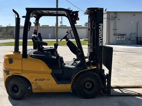 The Hyundai Pneumatic Tire 4 Wheel Sit Down Forklift has a maximum lifting capacity of up to 5,000 to 10,000 pounds, depending on the specific model and configuration.