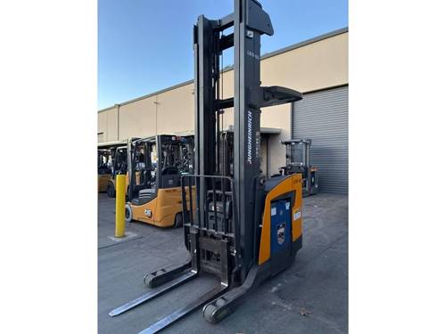 The Jungheinrich Electric Narrow Aisle Single Reach forklift typically has a lifting capacity ranging from 1,000 to 2,500 kg, making it ideal for a variety of warehouse and narrow aisle applications.