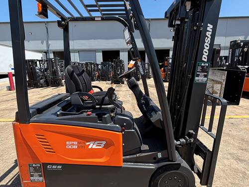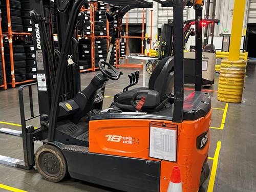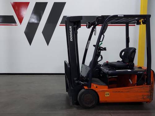 The Doosan Electric 3 Wheel Sit Down forklift has a weight capacity of up to 3,500 pounds, making it suitable for handling various loads in warehouses and distribution centers.