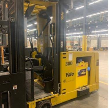 The Yale Electric Man Up Swing Reach Turret comes equipped with various safety features, including emergency stop buttons, operator presence sensors, and a sturdy overhead guard, to ensure the safety of both the operator and nearby personnel.