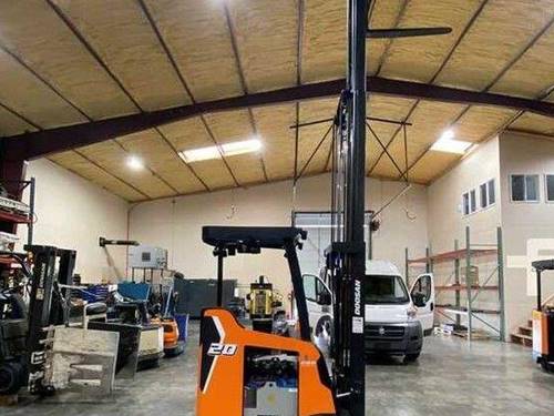 The Doosan Electric Walkie Counterbalanced Stacker has a maximum lift capacity of up to 2,500 lbs, making it suitable for a variety of warehouse and material handling applications.