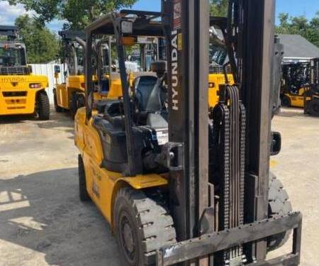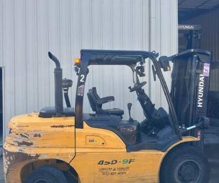 The Hyundai 45D-9F forklift stands out in the competitive material handling market with its robust design, optimized for both outdoor and indoor applications, thanks to its durable pneumatic tires and powerful diesel engine. Built from 2014 to 2023, this model boasts an impressive capacity, ideal for a variety of tasks in construction and warehousing environments. It comes standard with a reliable diesel engine, while also offering optional engines for diverse operational needs. Notably, the 45D-9F features an exceptional right-angle stack and turning radius, allowing for enhanced maneuverability in tight spaces—making it a practical choice over its competitors. Whether in tight aisles or rugged terrains, this forklift delivers both performance and versatility, ensuring it remains a top choice for businesses as Hyundai continues to innovate in the material handling sector.