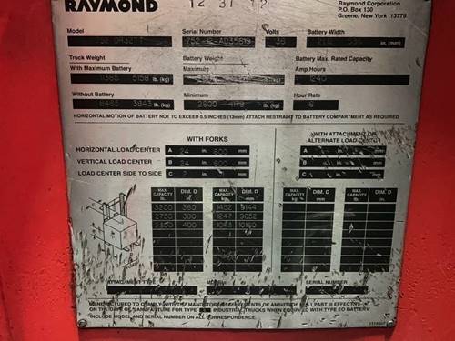 **General Specifications** - Model Number: 752-R45TT - Manufacturer: Raymond - Type: Forklift - Subtype: Electric Narrow Aisle Single Reach **Dimensions** - Overall Length: Approximately 107 inches - Overall Width: Approximately 42 inches - Wheelbase: Approximately 59 inches - Ground Clearance: Approximately 4 inches **Weight** - Service Weight: Approximately 7,500 lbs **Power Source** - Power Supply: Electric - Battery Type: Lead-acid or Lithium-ion options - Battery Voltage: 36V **Tires** - Tire Type: Cushion tires **Performance** - Load Capacity: Approximately 4,500 lbs - Travel Speed: Approximately 6.5 mph (loaded) - Gradeability: Approximately 12% (loaded) **Brake System** - System Type: Regenerative braking - Parking Brake: Automatic electronic brake **Operator Features** - Steering: Electronic power steering - Controls: Multi-function control handle - Seat: Adjustable, cushioned seat with seatbelt - Display: Digital multi-display for operational metrics **Additional Features** - Reach Mechanism: Single reach extendability - Fork Length: Varies - Side Shifter: Integrated side-shift function - Safety Systems: Overhead guard, operator presence sensor