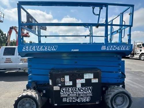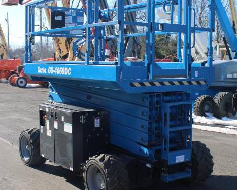 This scissor lift is designed for elevated performance on rough, uneven, and rugged surfaces, including dirt, gravel, and grassy areas, providing excellent traction and stability.