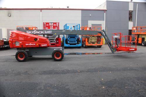 The Skyjack SJ45T is equipped with several safety features, including a tilt sensor, load sensing system, and emergency lowering system. These features help ensure operator safety by providing alerts for unsafe conditions and allowing for safe descent in case of an emergency.