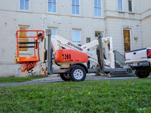 The Snorkel TL49J boom lift offers a maximum working height of 50 feet. This allows for a wide range of applications, making it suitable for tasks such as tree trimming, building maintenance, and other projects that require reaching elevated areas safely and efficiently.