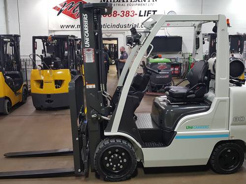The Unicarriers CF80LP forklift has a weight capacity of up to 8,000 pounds. This makes it suitable for handling heavy loads in indoor warehouse environments, ensuring that it can efficiently manage typical distribution and storage tasks.