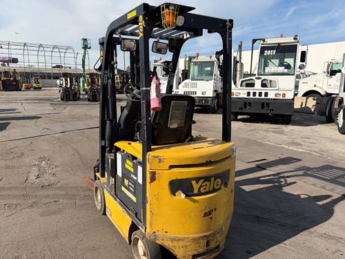 The Yale ERC040 is equipped with multiple safety features to enhance operator security and workplace safety. These include a robust overhead guard to protect the operator from falling objects, strategically placed lights and alarms for additional visibility and awareness, and a stability system to prevent tip-overs during operation. Moreover, the forklift includes a regenerative braking system that not only improves stopping power but also helps to extend battery life, ensuring the unit remains safe and reliable throughout its usage.