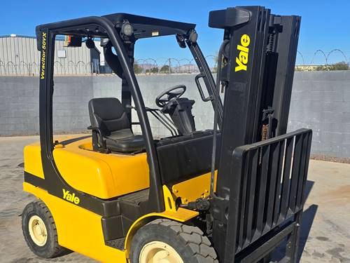 The Yale GDP050VX forklift has a lifting capacity of up to 5,000 pounds. This makes it suitable for various applications, particularly in warehouses and manufacturing environments where heavy loads need to be moved and stacked efficiently.