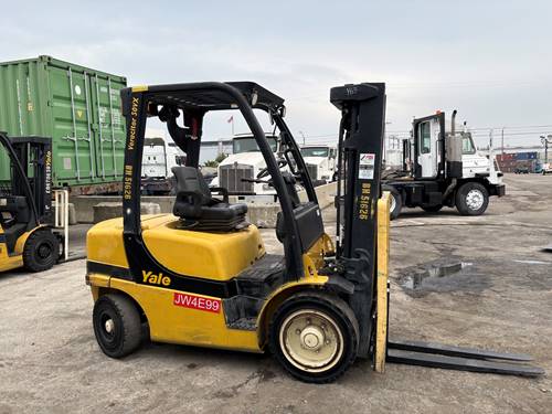 The Yale GDP050VX forklift typically uses propane as its fuel source, which is known for being cleaner burning compared to gasoline or diesel. This results in lower emissions, making it a more environmentally friendly option and contributing to a safer indoor working environment.