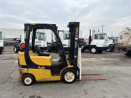 Designed for versatility, the Yale GLC050 forklift is equipped with durable tires that offer excellent traction on a variety of surfaces, including smooth concrete and rough outdoor terrain. Its robust construction and design allow it to perform reliably in diverse working conditions, making it a reliable choice for various applications.