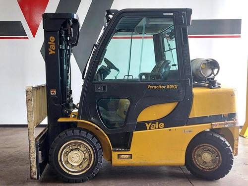 The Yale GP080VX forklift is ideal for various applications, particularly in outdoor environments where sturdiness is required. Its pneumatic tires make it suitable for rough terrain, making it a great choice for construction sites, lumber yards, and other outdoor material handling situations. Additionally, it can efficiently handle tasks within warehouses that require lifting heavy pallets or large items, making it a versatile piece of equipment for many industries.